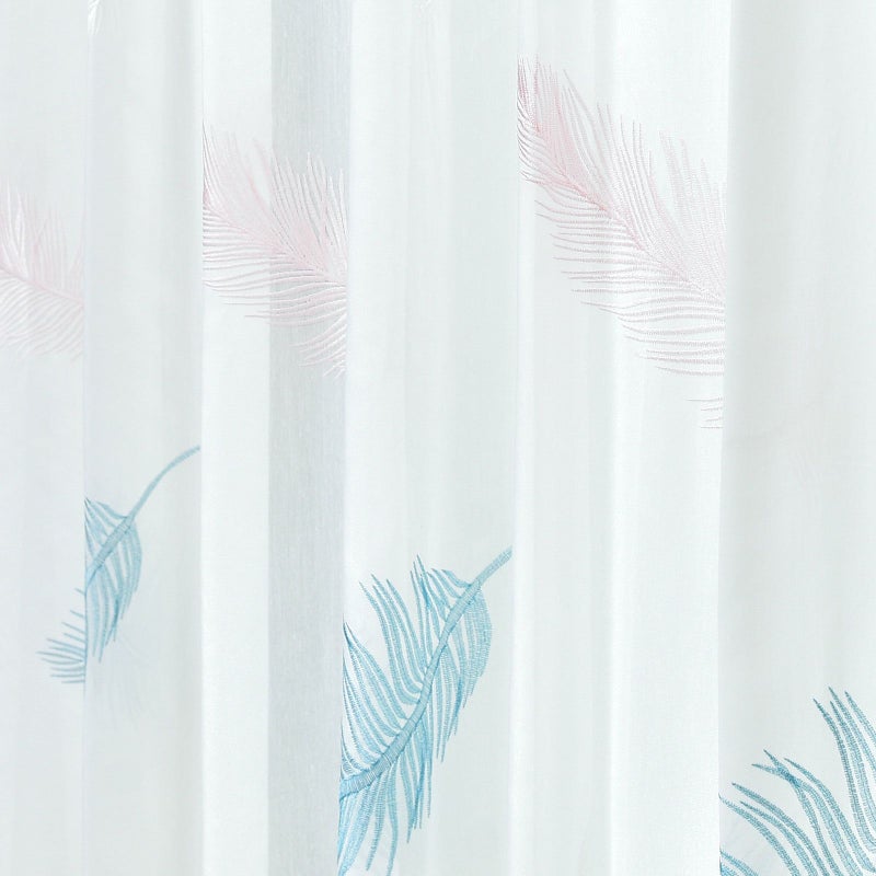 羽根が空に舞いひらひらと落ちていく様子を刺繍したシアーです。ラメ糸をポイントに使い、ゴージャスな雰囲気も持っています。裾から200cm程度まで刺繍が入っています。ウォッシャブルなのでお家でお洗濯が可能です。