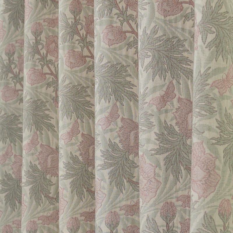 地模様の葉の上に可憐なアネモネの花を配した、やさしい柄です。シックな色調の多いモリス・コレクションの中ではめずらしい、淡い色使いのファブリックです。防炎性・保温性のあるカーテンでお部屋の寒さ対策&省エネ効果も期待できます。また、ウォッシャブルなのでお家でお洗濯が可能です。