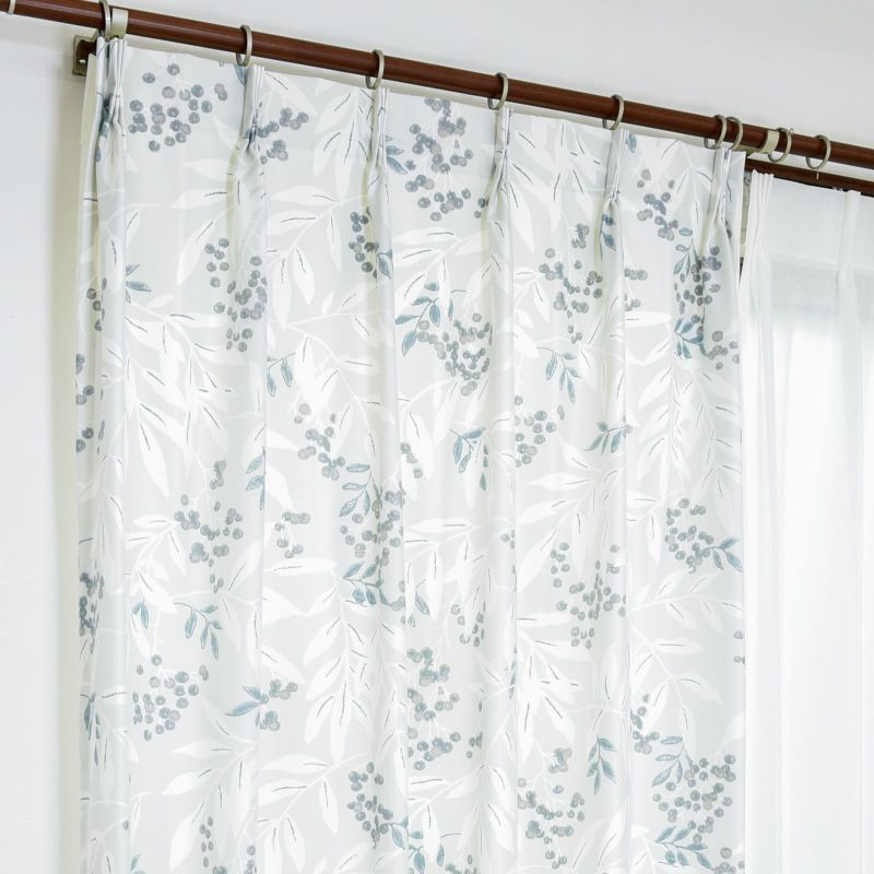 ペッパーやコトネアスターの木をモチーフにして描かれた、シンプルなスタイルの葉や実が象徴的なデザインのドレープです。防炎カーテンの設置が義務付けられているマンション等でも安心してお使いいただけます。また、ウォッシャブルなのでお家でお洗濯が可能です。