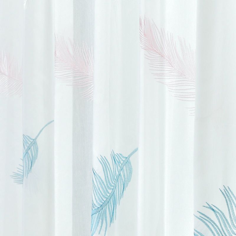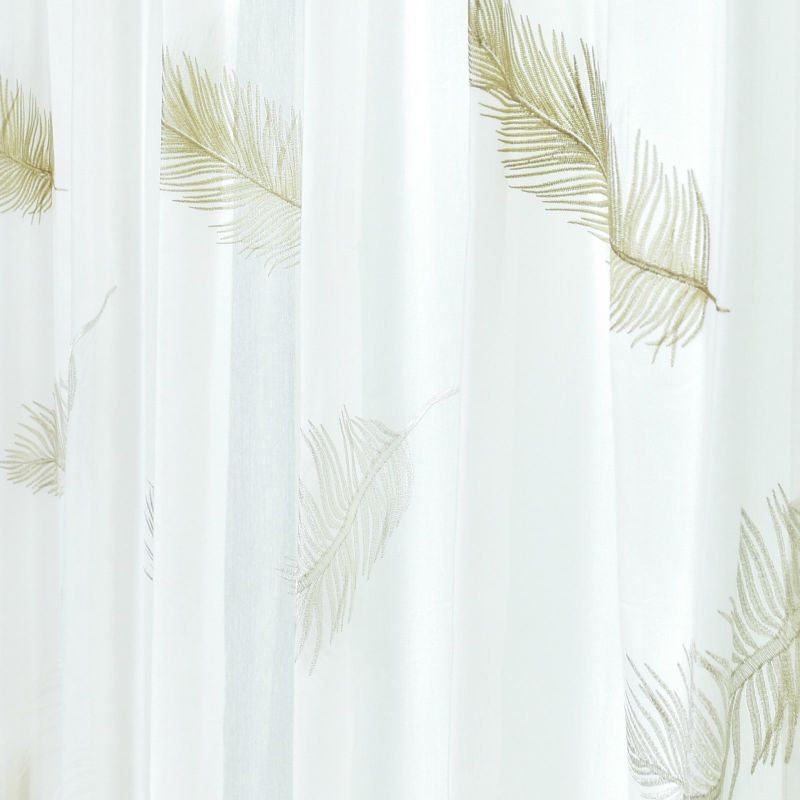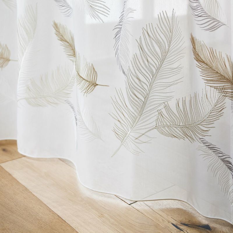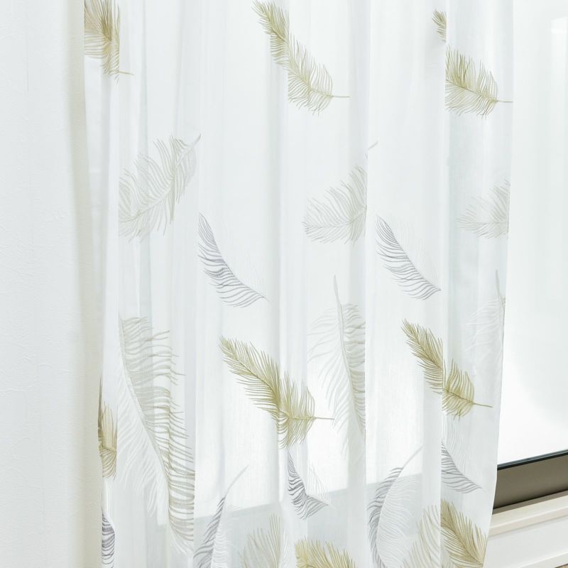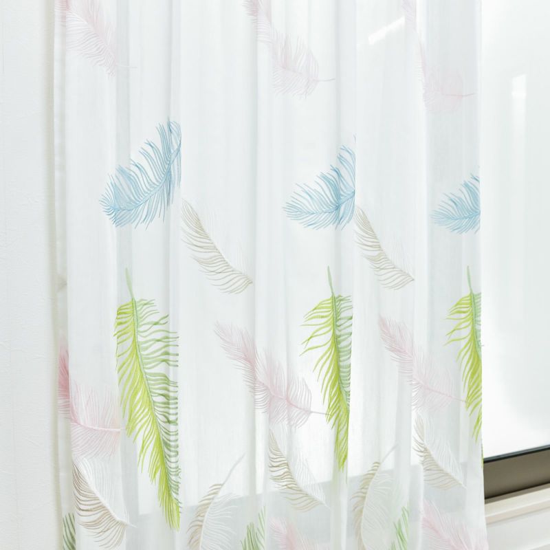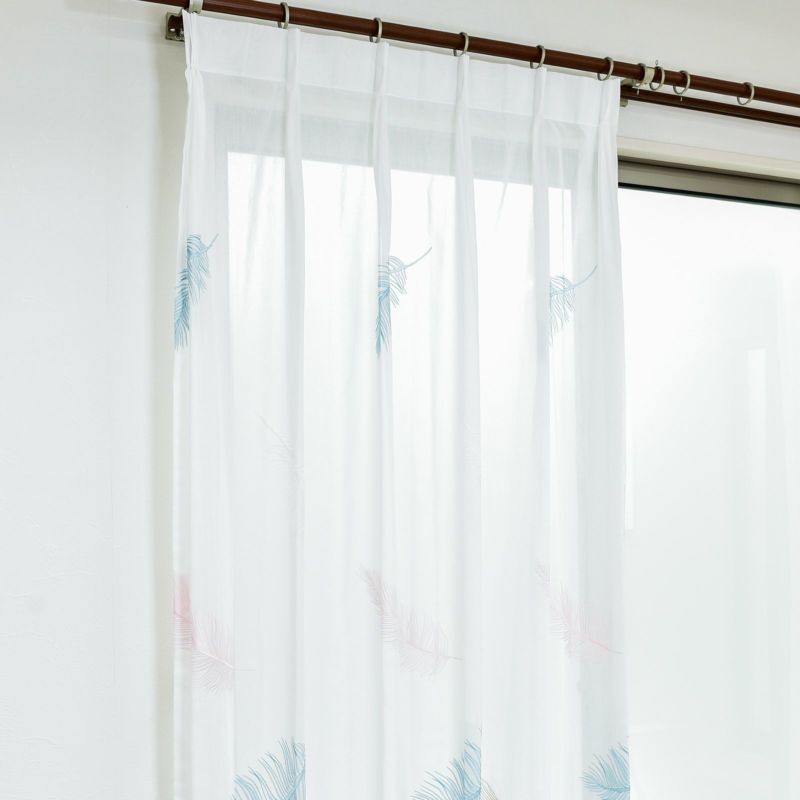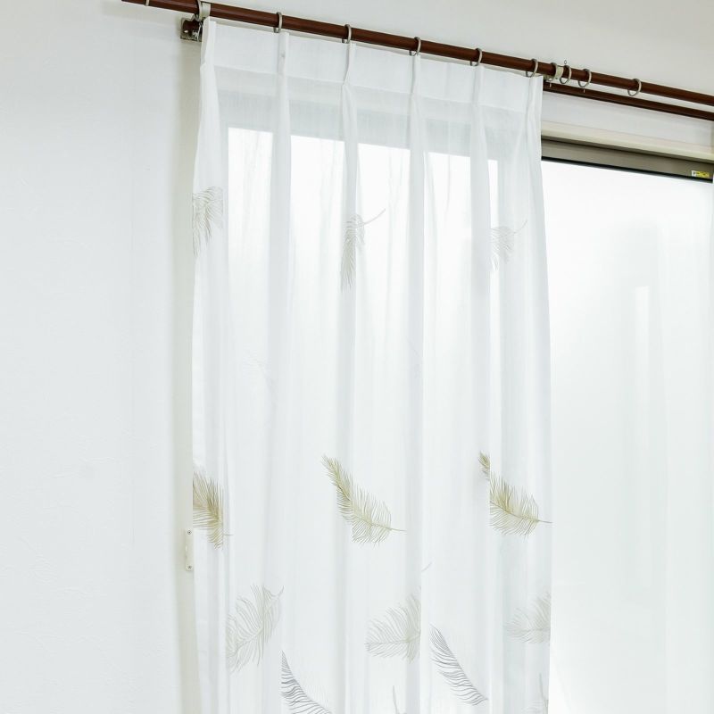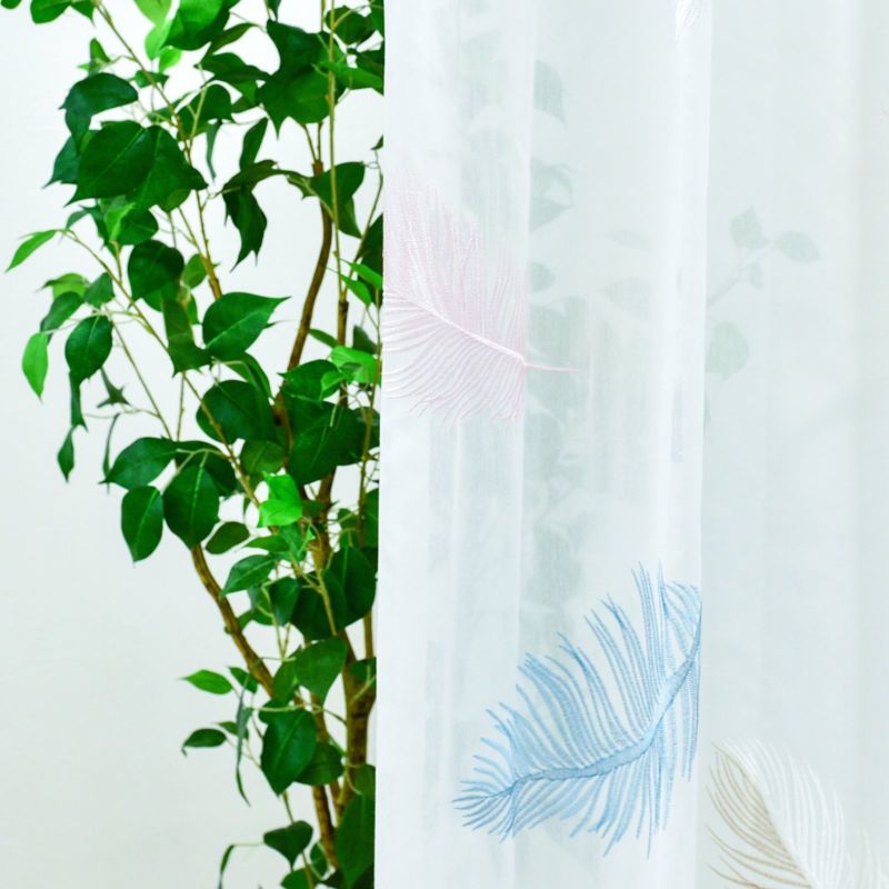 羽根が空に舞いひらひらと落ちていく様子を刺繍したシアーです。ラメ糸をポイントに使い、ゴージャスな雰囲気も持っています。裾から200cm程度まで刺繍が入っています。ウォッシャブルなのでお家でお洗濯が可能です。