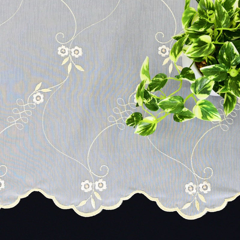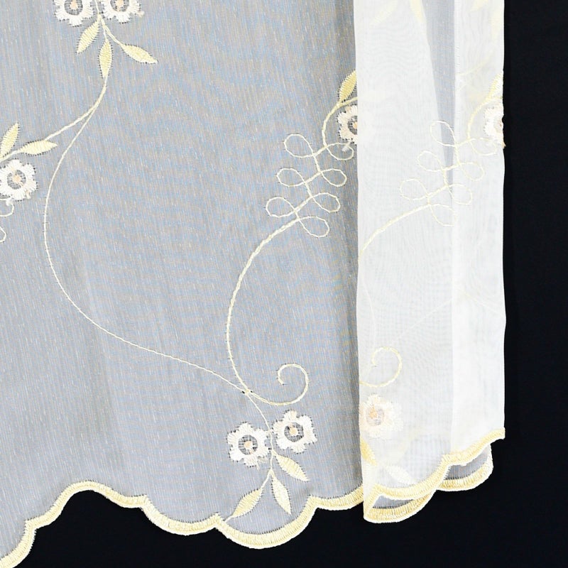 可愛らしい小花柄とリーフ柄が光沢のあるホワイトゴールドの糸で刺?されたエレガントなトルコレースカーテンです。裾のスカラップが高級感と優雅さを演出しています。ナチュラルや韓国インテリアにもおすすめのデザインです。